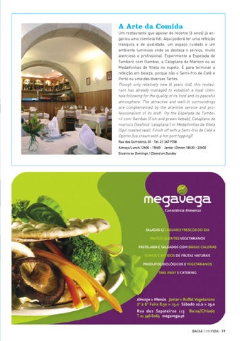 A Arte da Comida Um restaurante que apesar de recente (6 anos) já angariou uma clientela fiél. Aqui poderá ter uma refeição tranquila e de qualidade; um espaço cuidado e um ambiente luminoso onde se destaca o serviço, muito atencioso e profissional. Experimente a Espetada de Tamboril com Gambas, a Cataplana de Marisco ou as Medalhinhas de Vitela no espeto. E para terminar a refeição em beleza, porque não o Semi-frio de Café e Porto ou uma das diversas Tartes. Though only relatively new (6 years old), this restaurant has already managed to establish a loyal clientele following for the quality of its food and its peaceful atmosphere. The attractive and well-lit surroundings are complemented by the attentive service and professionalism of its staff. Try the Espetada de Tamboril com Gambas (Fish and prawn kebab), Cataplana de marisco (Seafood ‘cataplana’) or Medalhinhas de Vitela (Spit roasted veal). Finish off with a Semi-frio de Café e Oporto (Ice cream with a hot port topping)! Rua dos Correeiros, 81 · Tel. 21 347 9708 Almoço/Lunch 12h00 - 15h00 · Jantar /Dinner 18h30 - 22h00 Encerra ao Domingo / Closed on Sunday