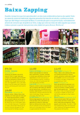 Baixa Zapping Guarde o tempo livre que tem para descobrir um dos mais emblemáticos bairros da capital. Visite as casas de comércio tradicional, algumas presentes há mais de um século, e conheça as novas lojas que dão folego à renovação da Baixa. A contribuição para a sua preservação, nomeadamente através do consumo que ali poderá ser feito, é algo que está nas mãos de todos aqueles que amam Lisboa e prezam o que de mais precioso esta cidade tem para oferecer. Divirta-se!