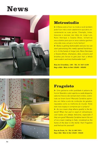 News Metrostudio > A Baixa está a ficar na moda e você também pode ficar indo a este cabeleireiro que abriu recentemente as suas portas. Champôs, tintas, tesouras e escovas nas mãos do Jorge Luís, Nuno Henrique e Susana Bravo, tornam-se seus aliados para que os seus cabelos ganhem uma vida nova, actual e muito fashion! > Baixa is getting fashionable and you too can start patronising this newly opened hairdresser’s. In the hands of Jorge Luís, Nuno Henrique e Susana Bravo, shampoos, dyes, scissors and brushes join forces to give your hair a whole new modern and very fashionable look! Rua do Crucifixo, 120 · Tel. 21 347 4129 Seg a Sáb / Mon to Sat 10h00 - 20h00