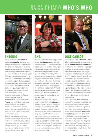Aberto desde 1888, o Paris em Lisboa já foi uma loja de alta-costura, onde o avô de José Carlos Sousa Gomes vestiu a Rainha Dona Amélia, passou por uma fase de armazém generalista, até que se especializou em artigos para casa. José Carlos está aqui desde 1971, quando tinha 19 anos. É com saudosismo que relembra tempos passados, quando os hábitos eram outros. Hoje em dia passeia menos na Baixa e no Chiado, mas continua a gostar da zona. “É a mais bonita da cidade”, diz. Gosta do contacto com os clientes, de observar o movimento da rua e das coisas simples que fazem História. Open since 1888, Paris em Lisboa once sold haute couture, José Carlos’ grandfather having dressed Queen Dona Amélia. It was then a ‘general store’ for a time, until specialising in articles for the home. José Carlos Sousa Gomes arrived in 1971, at 19. He looks back with nostalgia at the past, when things were different. He still likes the area. “It’s the prettiest part of town,” he says. He enjoys the customers, watching the life go by outside and the simple things that history is made of. baix a chiado con vida · 11