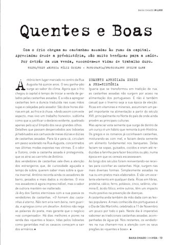 Quentes e Boas Com o frio chegam as castanhas assadas às ruas da capital. Apreciadas desde a pré-história, são muito benéficas para a saúde. Por detrás da sua venda, escondem-se vidas de trabalho duro. Texto/text andreia félix coelho · fotografia/photography evelyn kahn