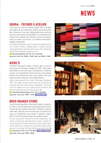 Boss Orange Store Uma linha da Hugo Boss mais descontraída e irreverente. Todo o conceito desta loja foi projectado pelo director criativo da casa, Andrea Cannelloni. Reflecte o espírito jovem das colecções, direccionado para um público que segue as tendências mais trendy. O glamour urbano bem no centro do Chiado. Onde mais poderia estar? A more casual and irreverent line from Hugo Boss. The whole concept was designed by the shop’s creative director Andrea Cannelloni and reflects the youthful spirit of the collections, aimed at the casual/chic style. Urban glamour in the heart of Chiado. Where else would it be? IL 4E