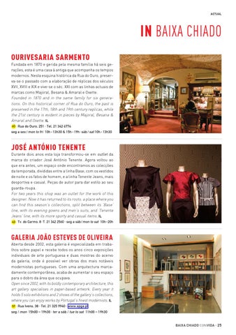 IN baixa chiado Ourivesaria Sarmento Fundada em 1870 e gerida pela mesma família há seis gerações, esta é uma casa à antiga que acompanha os tempos modernos. Nesta esquina histórica da Rua do Ouro, preserva-se o passado com a elaboração de réplicas dos séculos XVII, XVIII e XIX e vive-se o séc. XXI com as linhas actuais de marcas como Majoral, Besana & Amaral e Oxette. Founded in 1870 and in the same family for six generations. On this historical corner of Rua do Ouro, the past is preserved in the 17th, 18th and 19th century replicas, while the 21st century is evident in pieces by Majoral, Besana & Amaral and Oxette. il 6D