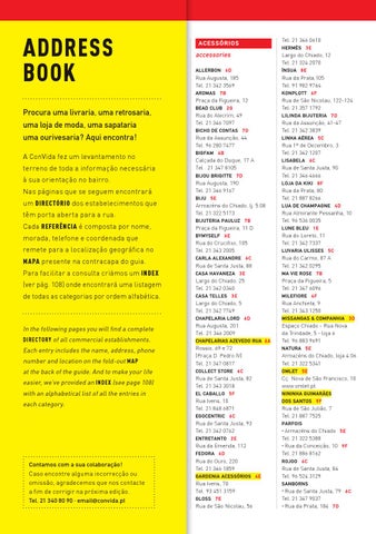 Address Book Procura uma livraria, uma retrosaria, uma loja de moda, uma sapataria uma ourivesaria? Aqui encontra! A ConVida fez um levantamento no terreno de toda a informação necessária à sua orientação no bairro. Nas páginas que se seguem encontrará um directório dos estabelecimentos que