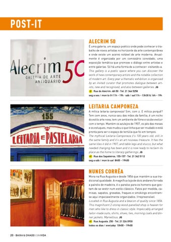 Nunes Corrêa Mora na Rua Augusta e desde 1856 que mantém a sua tradicional qualidade. A magnífica loja de dois andares forrada a painéis de madeira, é o paraíso para os homens que gostam de se vestir num estilo clássico. Fatos por medida, camisas, sapatos, gravatas, fraques e smokings encontramse aqui impecavelmente organizados. Irrepreensível. Located in Rua Augusta and a beacon of quality since 1856. This magnificent 2-storey wood-panelled shop is heaven for men who like to dress in classic style. Impeccably arranged tailor-made suits, shirts, shoes, ties, morning coats and dinner jackets. Marvellous. JG 6C