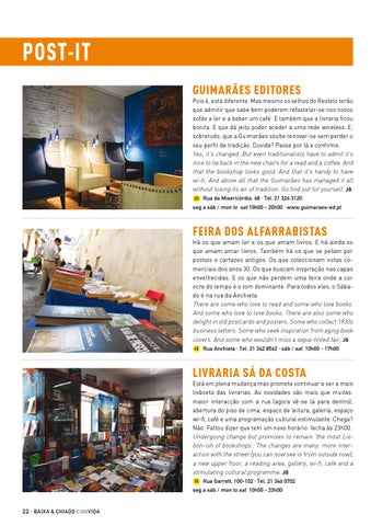 Livraria Sá da Costa Está em plena mudança mas promete continuar a ser a mais lisboeta das livrarias. As novidades são mais que muitas: maior interacção com a rua (agora vê-se lá para dentro), abertura do piso de cima, espaço de leitura, galeria, espaço wi-fi, café e uma programação cultural estimulante. Chega? Não. Faltou dizer que tem um novo horário: fecha às 23h00. Undergoing change but promises to remain ‘the most Lisbon-ish of bookshops’. The changes are many: more interaction with the street (you can now see in from outside now), a new upper floor, a reading area, gallery, wi-fi, café and a stimulating cultural programme. JG 3E