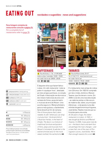 É daqueles sítios que faziam falta a Lisboa. Um café-restaurante “onde se pode vir a qualquer hora”, idealizado por dois amigos austríacos, no coração do Chiado. A decoração vive da mistura dos móveis tradicionais da zona com cartazes de filmes, peças de teatro e musicais da terra de Mozart. Uma escolha segura é o Wienerschnitzel e, para os mais gulosos, a Sachertorte. Serve brunch ao fim-de-semana. One of those places that Lisbon needed. A café “where you can drop in at any time”, the brainchild of 2 Austrian friends, in the heart of Chiado. The decor is a mixture of traditional furniture and posters of films, plays and musicals from Mozart’s homeland. A safe bet is the wienerschnitzel and, for the more sweet-toothed, the sachertorte. MB