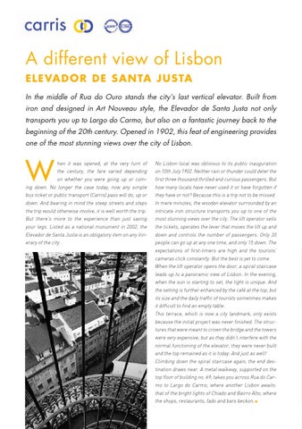 people can go up at any one time, and only 15 down. The expectations of first-timers are high and the tourists’ cameras click constantly. But the best is yet to come. When the lift operator opens the door, a spiral staircase leads up to a panoramic view of Lisbon. In the evening, when the sun is starting to set, the light is unique. And the setting is further enhanced by the café at the top, but its size and the daily traffic of tourists sometimes makes it difficult to find an empty table. This terrace, which is now a city landmark, only exists because the initial project was never finished. The structures that were meant to crown the bridge and the towers were very expensive, but as they didn’t interfere with the normal functioning of the elevator, they were never built and the top remained as it is today. And just as well! Climbing down the spiral staircase again, the end destination draws near. A metal walkway, supported on the top floor of building no. 69, takes you across Rua do Carmo to Largo do Carmo, where another Lisbon awaits: that of the bright lights of Chiado and Bairro Alto, where the shops, restaurants, fado and bars beckon.•