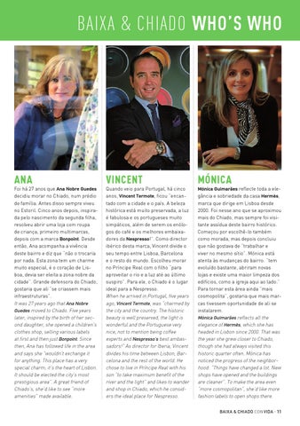 Mónica Guimarães reflecte toda a elegância e sobriedade da casa Hermès, marca que dirige em Lisboa desde 2000. Foi nesse ano que se aproximou mais do Chiado, mas sempre foi visitante assídua deste bairro histórico. Começou por escolhê-lo também como morada, mas depois concluiu que não gostava de “trabalhar e viver no mesmo sítio”. Mónica está atenta às mudanças do bairro: “tem evoluído bastante, abriram novas lojas e existe uma maior limpeza dos edifícios, como a igreja aqui ao lado.” Para tornar esta área ainda “mais cosmopolita”, gostaria que mais marcas tivessem oportunidade de ali se instalarem. Mónica Guimarães reflects all the elegance of Hermès, which she has headed in Lisbon since 2000. That was the year she grew closer to Chiado, though she had always visited this historic quarter often. Mónica has noticed the progress of the neighborhood: “Things have changed a lot. New shops have opened and the buildings are cleaner”. To make the area even “more cosmopolitan”, she’d like more fashion labels to open shops there. baix a & chiado con vida · 11