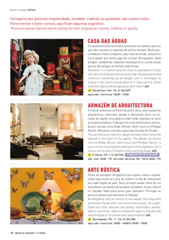 Arte Rústica Ponto de paragem obrigatório para quem visita a capital, nesta loja encontra o que de melhor se faz de artesanato em cada região do país. Num primeiro andar cheio de luz descobrem-se painéis de azulejos, bordados, loiças, têxteis ou calçado. Ideal para quem quer descobrir Portugal ou para os nativos que valorizam a tradição. An obligatory stop for visitors to the capital, this shop sells all the best handicrafts from around the country. On a lightfilled first floor, discover tile panels, embroidery, pottery, fabrics and shoes. Ideal for those who want to discover the real Portugal or for natives who value tradition. Afc 6D