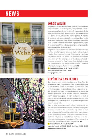 news Jorge Welsh Jorge Welsh é uma referência nacional no panorama das antiguidades e o único antiquário português com um espaço comercial aberto em Londres. A inauguração desta nova galeria no Chiado vem substituir a que existia em São Bento e que, entretanto, fechou portas. A mostra de obras de arte e as exposições temáticas são o ponto forte deste lindíssimo espaço, concebido pelo arquitecto João Andrade, onde se encontram especialmente peças de porcelana da China e de outras origens longínquas de grande qualidade. A não perder! Jorge Welsh is a national icon within the world of antiques and the only Portuguese antiques dealer with a shop in London. The opening of his new Chiado gallery replaces the previous one in São Bento. The artworks and themed exhibitions are the strongpoint of this beautiful establishment, designed by the architect João Andrade, where you’ll find pieces of fine quality porcelain from China and other distant origins. Not to be missed! AFC 2D