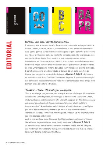 ConVida, Com Vida, Convite. Convite à Vida. É o nosso prazer e o nosso desafio. Fazemos-lhe um convite a abraçar a vida de Lisboa, Urbana, Cultural, Musical, Gastronómica. A vida para Viver com maiúscula. Com a garra e curiosidade necessárias para se pôr a caminho e descobrir o que há por aí. Caso não saiba ou não tenha pensado nisso, não se preocupe, nós damos-lhe ideias do que fazer, onde ir, o que comprar ou onde jantar... Não deixe de ler “Um coração em chamas”, o texto de Catarina Portas que assinala nesta edição os vinte anos do incêndio brutal que tomou o Chiado no Verão de 1988. Uma tragédia na história de Lisboa e um marco para o rumo do Chiado. E para finalizar, uma grande novidade: a Convida dá um salto para fora de Lisboa. Iremos publicar uma edição dedicada a Cascais & Estoril, não fossem as fundadoras dos Guias ConVida Estorilenses de gema. É por isso com emoção que damos aos nossos leitores uma visão muito personalizada desta antiga zona balnear, cheia de história e tradição.