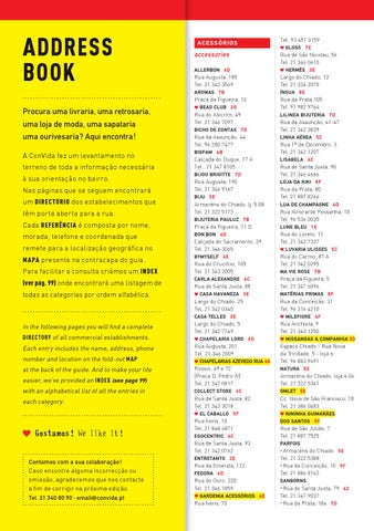 Address Book Procura uma livraria, uma retrosaria, uma loja de moda, uma sapataria uma ourivesaria? Aqui encontra! A ConVida fez um levantamento no terreno de toda a informação necessária à sua orientação no bairro. Nas páginas que se seguem encontrará um directório dos estabelecimentos que