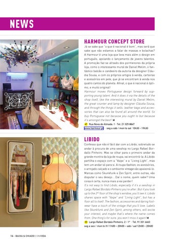 Libido Confesso que não é fácil dar com a Libido, sobretudo se andar à procura de uma sexshop no Largo Rafael Bordallo Pinheiro. Mas se olhar para o primeiro andar da grande montra da loja de roupa, vai encontrá-la. A Libido partilha o espaço com a “Vaipe” e a “Living Light”, mas tem um andar só para si. A roupa fashion, os acessórios, o arrojado calçado e o ambiente vintage vão apaixoná-lo. Marcas como Skunkfunk e Zen Spirit, entre outras, vão disputar o seu desejo... Daí o nome, quem sabe? Uma coisa é certa, nunca mais a vai perder! It’s not easy to find Libido, especially if it’s a sexshop in Largo Rafael Bordalo Pinheiro you’re after. But if you look up to the 2nd floor of the shop’s window, you’ll see it. Libido shares space with “Vaipe” and “Living Light”, but has a floor all to itself. The fashion, accessories and daring footwear have a touch of the vintage that you’ll love. Labels like Skunkfunk and Zen Spirit, among others, will excite your interest, and maybe that’s where the name comes from. One thing’s for sure: you won’t miss it again! M 3D