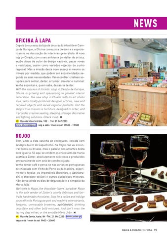 Rojoo Bem-vindo a esta casinha de chocolates, vestida com azulejos da cor do Capuchinho. Na Rojoo não vai encontrar lobos ou bruxas, mas o paraíso dos amantes desta doce iguaria. Só aqui se vendem os chocolates da marca austríaca Zotter, absolutamente deliciosos e produzidos artesanalmente com selo de comércio justo. Venha tomar café e perca-se nas variantes portuguesas de chocolate com Vinho do Porto ou da Madeira, experimente o fondue, os imperdíveis Brownies, o Apfelstrüdel, o chocolate solúvel e outras audaciosas misturas. Não perca ainda os dias de degustação e a simpatia da Maria João. Welcome to Rojoo, the chocolate-lovers’ paradise! Rojoo is the sole vendor of Zotter’s utterly delicious and fairtrade handmade chocolates. Stop for a coffee and indulge yourself in its Portuguse port and madeira wine variants, fondants, unmissable brownies, apfelstrüdel, drinking chocolate and other bold mixtures. And don’t miss the tasting days either, or the amiable Maria João. M 6C