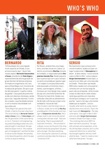 Normalmente o que começa como uma brincadeira acaba a ocupar um lugar fundamental. O Mezzogiorno foi assim. A ideia nasceu “numa noite de copos no Bairro Alto” e pouco depois Sergio Cammarosano trocava Sapri, a sua terra em Itália, por uma nova vida no Chiado. “Posso dizer que desde 2002 estou casado com uma pizzeria”, comenta com um sorriso largo de quem não se arrepende. Já fez muitas coisas na vida mas foi neste restaurante (que partilha com mais dois sócios) que conseguiu unir o que é ao que faz: “quero criar aqui uma mentalidade que se espalhe”, conclui. Usually, what starts as a joke, eventually becomes more serious. That’s the way it was with Mezzogiorno. The idea came about “one night in Bairro Alto” and soon after Sergio Cammarosano moved to Chiado from Sapri in Italy. “You could say that since 2002 I’ve been married to a pizzeria,” he says with a broad, and unrepentant, smile. His life has been colourful, but it is this restaurant (which he co-owns) that has brought together who he is with what he does: “I want to create a mentality here that grows,” he says. baiX A & CHIADO con vida · 23