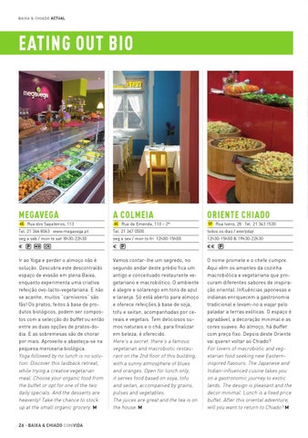 O nome promete e o chefe cumpre. Aqui vêm os amantes da cozinha macrobiótica e vegetariana que procuram diferentes sabores de inspiração oriental. Influências japonesas e indianas enriquecem a gastronomia tradicional e levam-no a viajar pelo paladar a terras exóticas. O espaço é agradável, a decoração minimal e as cores suaves. Ao almoço, há buffet com preço fixo. Depois deste Oriente vai querer voltar ao Chiado? For lovers of macrobiotic and vegetarian food seeking new Easterninspired flavours. The Japanese and Indian-influenced cusine takes you on a gastronomic journey to exotic lands. The design is pleasant and the decor minimal. Lunch is a fixed price buffet. After this oriental adventure, will you want to return to Chiado? M