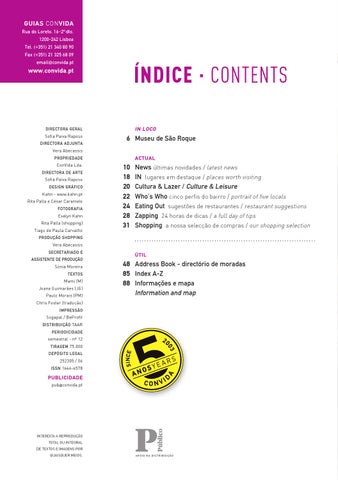 News últimas novidades / latest news IN lugares em destaque / places worth visiting Cultura & Lazer / Culture & Leisure Who’s Who cinco perfis do bairro / portrait of five locals Eating Out sugestões de restaurantes / restaurant suggestions Zapping 24 horas de dicas / a full day of tips Shopping a nossa selecção de compras / our shopping selection