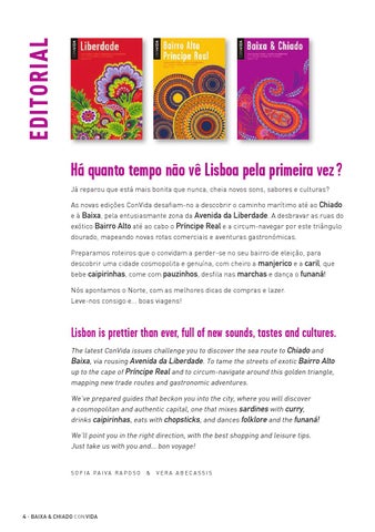 EDITORIAL Há quanto tempo não vê Lisboa pela primeira vez? Já reparou que está mais bonita que nunca, cheia novos sons, sabores e culturas? As novas edições ConVida desafiam-no a descobrir o caminho marítimo até ao Chiado e à Baixa, pela entusiasmante zona da Avenida da Liberdade. A desbravar as ruas do exótico Bairro Alto até ao cabo o Príncipe Real e a circum-navegar por este triângulo dourado, mapeando novas rotas comerciais e aventuras gastronómicas. Preparamos roteiros que o convidam a perder-se no seu bairro de eleição, para descobrir uma cidade cosmopolita e genuína, com cheiro a manjerico e a caril, que bebe caipirinhas, come com pauzinhos, desfila nas marchas e dança o funaná! Nós apontamos o Norte, com as melhores dicas de compras e lazer. Leve-nos consigo e… boas viagens!