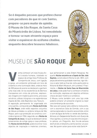 que pertenceram a esta Ordem Religiosa. No quarto Núcleo encontra-se a Capela de São João Baptista, construída em Roma no séc. XVIII, com peças de extrema qualidade inventiva, rigor técnico e valor (até ao final de Julho parte está no Victoria & Albert Museum, em Londres). Finalmente, o Núcleo da Santa Casa da Misericórdia de Lisboa, onde pode ficar a conhecer a História da instituição, expressa em objectos artísticos cheios de valor histórico e simbólico. O Museu conta também com uma loja onde poderá comprar um presente original ou levar uma lembrança da sua visita. Não saia sem passar pela cafetaria-restaurante, com a assinatura Casa da Comida, com a sua calma esplanada no claustro seiscentista, entre o som da água da fonte e o verde dos bambus. Almoce um Carpaccio de Novilho com Queijo da Ilha e agriões, ou tome um copo de vinho enquanto petisca um Preguinho. Aos fins-de-semana desfrute de um brunch ou venha lanchar uns scones. Vai querer voltar para visitar este Santo!•