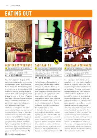 Aqui mora o pecado da gula. Entre cetins, veludos e rendas sentimo-nos transportados para o décor do filme Marie Antoinette. Aberto só ao jantar tem um menu de degustação por E38 que inclui entrada, prato principal e sorbet. Pode ainda optar pelos pratos à la carte, onde se destaca a Picanha de Kobe e o Risotto Nero de bacalhau fresco, duas especialidades a não perder com a assinatura do jovem, mas já famoso, chef Olivier. The home of indulgence. Amid the satin, velvet and lace, you feel yourself transported onto the set of Marie Antoinette. Open only for dinner, it has a tasting menu (E38) that includes a starter, main course and sorbet. Or you can order à la carte, with highlights including Kobe Beef Entrecote and Risotto Nero with fresh cod, two unmissable signature dishes by the young and famous Chef Olivier. PS 20 · con vida baiX A & CHIADO