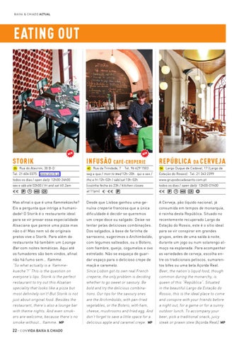 Mas afinal o que é uma flammekueche? Eis a pergunta que intriga a humanidade! O Storik é o restaurante ideal para se vir provar essa especialidade Alsaciana que parece uma pizza mas não o é! Mas nem só de originais pratos vive o Storik. Para além do restaurante há também um Lounge Bar com noites temáticas. Aqui até os fumadores são bem vindos, afinal não há fumo sem… flamme. “So what actually is a ‘flammekueche’?” This is the question on everyone’s lips. Storik is the perfect restaurant to try out this Alsatian speciality that looks like a pizza but most definitely isn’t! But Storik is not just about original food. Besides the restaurant, there’s also a lounge bar with theme nights. And even smokers are welcome, because there’s no smoke without… flamme. MP 22 · con vida baiX A & CHIADO
