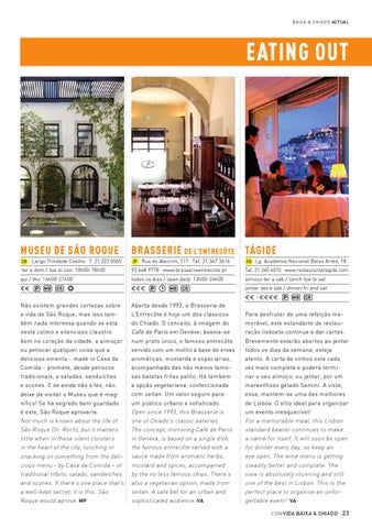 Para desfrutar de uma refeição memorável, este estandarte da restauração lisboeta continua a dar cartas. Brevemente estarão abertos ao jantar todos os dias da semana, esteja atento. A carta de vinhos está cada vez mais completa e poderá terminar o seu almoço, ou jantar, por um maravilhoso gelado Santini. A vista, essa, mantém-se uma das melhores de Lisboa. O sítio ideal para organizar um evento inesquecível! For a memorable meal, this Lisbon standard bearer continues to make a name for itself. It will soon be open for dinner every day, so keep an eye open. The wine menu is getting steadily better and complete. The view is absolutely stunning and still one of the best in Lisbon. This is the perfect place to organise an unforgettable event! VA con vida baiX A & CHIADO · 23