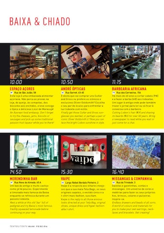 7D Rua dos Correeiros, 156 Há mais de 60 anos a cortar cabelo (9€) e a fazer a barba (6€) aos lisboetas. Um lugar à antiga onde pode também trazer o jornal para ler ou só ficar à conversa com o barbeiro. Cutting Lisbon’s hair (E9) and shaving its beards (E6) for over 60 years. Bring a newspaper to read while you wait or just come for a chat.
