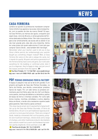 PDF PENHAS DOURADAS FOOD & FACTORY O espaço é pequeno mas sai-se de lá em grande. É um projecto português da Casa das Penhas Douradas, na Serra da Estrela, que decidiu comercializar produtos típicos da região. Por um lado temos os produtos alimentares gourmet feitos pela mão do chef Luís Baena, como pestos, ketchups de abóbora ou de boletus, palitos de Queijo da Serra e chutneys variados. Por outro lado temos mantas, mochilas, almofadas e outros objectos feitos em Burel, o tecido ultra resistente e quente usado pelos pastores. Vale mesmo a pena conhecer. This shop may be small, but it’s packed full of great stuff. Set up by the Casa das Penhas Douradas, of Serra da Estrela fame, the aim is to sell traditional regional products but in a more gourmet version. There are a range of foods, made by a renowned chef, such as pestos, pumpkin and mushroom ketchups, cheese sticks and a range of chutneys, and other traditional products like blankets and cushions made from a warm and hardwearing material used by shepherds. Come and have a look. MP 5E