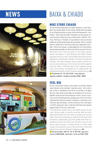 BAIXA & CHIADO NIKE STORE CHIADO Já não há desculpas para não fazer desporto, como também não há para fazê-lo sem estilo. Desde Abril que pode vir ao Chiado escolher os seus outfits da Nike para a “malhação”. Num total de 420m2 divididos em dois pisos, encontra várias linhas da marca: Sportswear, Athletic Training, Running e Football. A loja oferece vários serviços especiais de personalização de camisolas, ténis e outras peças e ainda terá o Running Club que organizará corridas / treinos em grupo, coordenadas por um funcionário da loja especializado em Running. Ponha-se já em forma! Now there are no more excuses for not doing exercise and for not doing it in style. Because since April, Chiado has been home to a new 2-storey Nike Store with sections dedicated to Sportswear, Athletic Training, Running and Football. The shop provides various special services so you can personalise your shirt, trainers and other apparel and also offers a Running Club which organises group races and training coordinated by an experienced and specialised member of staff. So get up and get moving! VA 5E