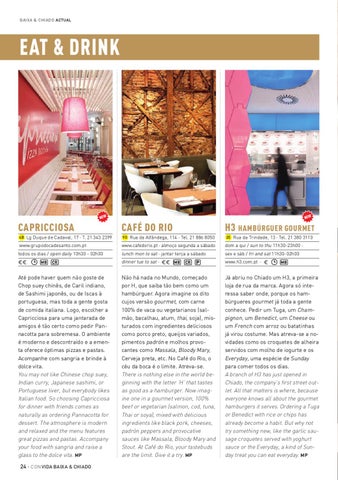 Até pode haver quem não goste de Chop suey chinês, de Caril indiano, de Sashimi japonês, ou de Iscas à portuguesa, mas toda a gente gosta de comida italiana. Logo, escolher a Capricciosa para uma jantarada de amigos é tão certo como pedir Pannacotta para sobremesa. O ambiente é moderno e descontraído e a ementa oferece óptimas pizzas e pastas. Acompanhe com sangria e brinde à dolce vita. You may not like Chinese chop suey, Indian curry, Japanese sashimi, or Portuguese liver, but everybody likes Italian food. So choosing Capricciosa for dinner with friends comes as naturally as ordering Pannacotta for dessert. The atmosphere is modern and relaxed and the menu features great pizzas and pastas. Accompany your food with sangria and raise a glass to the dolce vita. MP 24 · CON VIDA BAIX A & CHIADO