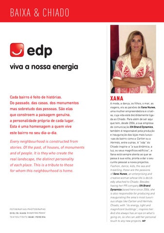 A moda, a dança, os filhos, o mar, as viagens, eis as paixões de Xana Nunes, uma mulher empreendedora e criativa, cuja vida está decididamente ligada ao Chiado. Para além de ser aqui que tem, desde 2006, a sua empresa de comunicação XN Brand Dynamics, também é responsável pela produção e inauguração das lojas mais luxuo-sas do bairro como a Cartier ou a Hermès, entre outras. A “vida” do Chiado inspira-a “a sua dinâmica, a luz, os seus magníficos edifícios”, e Xana está sempre atenta ao que se passa à sua volta, pronta a dar o seu cunho pessoal a novos projectos. Fashion, dance, kids, the sea and travelling, these are the passions of Xana Nunes, an enterprising and creative woman whose life is decidedly attached to Chiado. Besides having her PR company XN Brand Dynamics based here since 2006, she is also responsible for producing and inaugurating the area’s most luxurious shops like Cartier and Hermès. Chiado, with “its energy, light and magnificent buildings”, inspires her. And she always has an eye on what’s going on, so she can add her personal touch to any new projects. MP