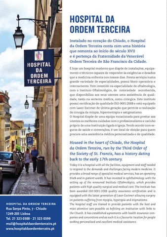 HOSPITAL DA ORDEM TERCEIRA Instalado no coração do Chiado, o Hospital da Ordem Terceira conta com uma história que remonta ao início do século XVII e é pertença da Fraternidade da Venerável Ordem Terceira de São Francisco da Cidade. É hoje um hospital moderno que dispõe de instalações, equipamento e técnicos capazes de responder às exigências e desafios que a medicina enfrenta nos nossos dias. Presta serviços numa grande variedade de especialidades, possui bloco operatório e internamento. Tem investido na especialidade de oftalmologia, com o Instituto Oftalmológico, de notoriedade reconhecida, que disponibiliza aos seus utentes uma assistência de qualidade, tanto na vertente médica, como cirúrgica. Este instituto possui certificação de qualidade ISO-9001:2008 e está equipado com Laser Excimer de última geração que permite a realização de cirurgia da miopia, hipermetropia e astigmatismo. O Hospital dispõe de uma equipa vocacionada para prestar aos utentes os melhores cuidados com o profissionalismo e carinho próprio de uma Instituição ligada à Igreja. Tendo acordo com seguros de saúde e convenções, é um local de eleição para quem procura uma assistência médica personalizada e de qualidade.