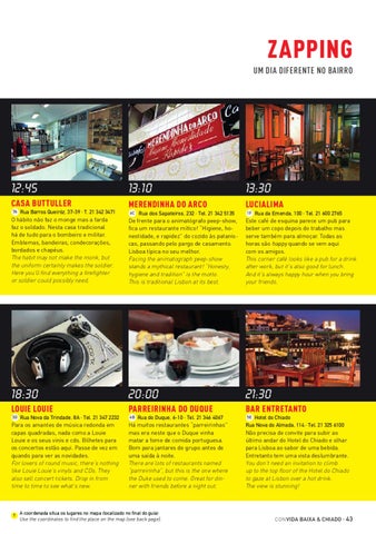 5E Hotel do Chiado Rua Nova do Almada, 114 · Tel. 21 325 6100 Não precisa de convite para subir ao último andar do Hotel do Chiado e olhar para Lisboa ao sabor de uma bebida. Entretanto tem uma vista deslumbrante. You don’t need an invitation to climb up to the top floor of the Hotel do Chiado to gaze at Lisbon over a hot drink. The view is stunning!