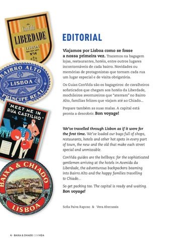 EDITORIAL Viajamos por Lisboa como se fosse a nossa primeira vez. Trazemos na bagagem lojas, restaurantes, hotéis, entre outros lugares incontornáveis de cada bairro. Novidades ou memórias de protagonistas que tornam cada rua um lugar especial e de visita obrigatória. Os Guias ConVida são os bagageiros: de cavalheiros sofisticados que chegam aos hotéis da Liberdade, mochileiros aventureiros que “aterram” no Bairro Alto, famílias felizes que viajam até ao Chiado... Prepare também as suas malas. A capital está pronta a descobrir. Bon voyage!