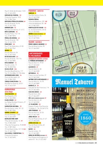 CASA MACÁRIO 6C Rua Augusta, 272 Tel. 21 342 0900 CLARA CHIADO 3D Lg. Rafael Bordalo Pinheiro, 27 Tel. 21 343 1267 GARRAFEIRA NACIONAL 7C Rua de Santa Justa, 18 - 22 Tel. 21 887 9004 MANUEL TAVARES 6B Rua da Betesga, 1 A/B Tel. 21 342 4209 NAPOLEÃO WINE SHOP • Rua da Conceição, 16 9F Tel. 21 885 2038 • Rua dos Fanqueiros, 70-88 9 F Tel. 21 887 2042 • R. da Misericórdia, 121-123 2 D Tel. 21 342 7182 SALA OGIVAL / VINIPORTUGAL 7H Praça do Comércio Tel. 21 342 0690