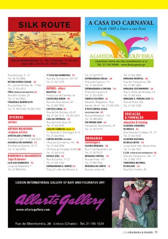 EDUCAÇÃO & FORMAÇÃO education & training ACADEMIA AMADORES DE MÚSICA 3 C Rua Nova da Trindade, 18 - 2º Tel. 21 342 5022 ACADEMIA NACIONAL DE BELAS ARTES 5 G Largo Acad. Nac. Belas Artes Tel. 21 346 7091 C.E.M. (CENTRO DE ARTES PERFORMATIVAS) 8 E Rua dos Fanqueiros, 150 - 1º Tel. 21 887 1917 COMPANHIA NACIONAL DE BAILADO 4 H Rua Vítor Cordon, 20