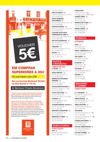 FOTOGRAFIA photography AFARI 7 E Rua Augusta, 112 Tel. 21 342 8836 EMBAIX. LOMOGRÁFICA LX 8 D Rua da Assunção, 13-15 Tel. 21 342 1075 FNAC SERVICE 5 E Armazéns do Chiado Tel. 21 322 1828 FOTOCOLOR 5 C Rua do Ouro, 291 Tel. 21 346 4242 FOTOZIGNIO 2 E Rua da Misericórdia, 23 Tel. 21 342 6919 INSTANTA 4 E Rua Garrett, 40 Tel. 21 346 6540