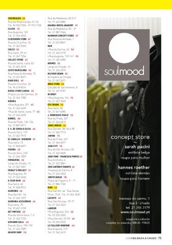 CHICORAÇÃO 2D Rua da Misericórdia, 51-53 Tel. 96 930 7096 · 91 972 1730 CLAVIS 7E Rua Augusta, 120 Tel. 21 346 4832 CLOCKWORK STORE 6F Rua do Crucifixo, 32 Tel. 21 342 9245 COLCCI 5E Rua Ivens, 59-61 Tel. 21 347 7254 COLLECT STORE 6C Rua de Santa Justa, 82 Tel. 21 343 3018 CUSTO BARCELONA 5E Rua Nova do Almada, 75 Tel. 21 347 8371 DARK DOLL 6F Rua do Crucifixo, 33 Tel. 96 618 6014 DIESEL STORE LISBOA 2E Praça Luís de Camões, 30 Tel. 21 342 1980 DIMODA • Rua Augusta, 251 6C Tel. 21 343 2459 • Rua de Santa Justa, 77 6C Tel. 21 343 2459 DURBEL 8E Rua da Prata, 134-136 Tel. 21 887 9011 E. E. DE SOUSA & SILVA 6E Rua do Ouro, 157 Tel. 21 342 7915 EL CABALLO · BARBOUR 5F Rua Ivens, 10 Tel. 21 848 6871 FEDORA 6D Rua do Ouro, 220 Tel. 21 346 1859 FORNARINA 3E Largo do Chiado, 13 Tel. 21 347 2067 FRIDAY’S PROJECT 7F Rua Augusta, 93 Tel. 21 343 2404 G-STAR RAW 4E Rua Ivens, 62 Tel. 91 508 9912 GARDENIA 4E Rua Garrett 54 Tel. 21 342 1207 GARDENIA ACESSÓRIOS 4E Rua Ivens, 70 Tel. 93 451 3159 GET VINTAGE 2E Rua da Horta Seca, 1-3 Tel. 21 342 7153 GIOVANNI GALLI 6D Rua do Ouro, 190-192 Tel. 21 342 7089 GRAVER SHOP 9E