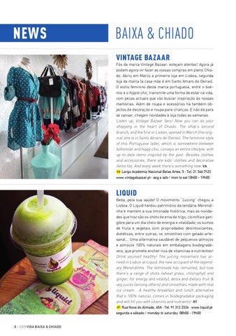 BAIXA & CHIADO VINTAGE BAZAAR Fãs da marca Vintage Bazaar: estejam atentas! Agora já podem agora vir fazer as vossas compras em pleno Chiado. Abriu em Março a primeira loja em Lisboa, segunda loja da marca (a casa mãe é em Santo Amaro de Oeiras). O estilo feminino desta marca portuguesa, entre o boémio e o hippie chic, transmite uma forma de estar na vida, com peças actuais que vão buscar inspiração às nossas memórias. Além de roupa e acessórios há também objectos de decoração e roupa para crianças. E não dá para se cansar, chegam novidades à loja todas as semanas. Listen up, Vintage Bazaar fans! Now you can do your shopping in the heart of Chiado. The shop’s second branch, and the first in Lisbon, opened in March (the original one is in Santo Amaro de Oeiras). The feminine style of this Portuguese label, which is somewhere between bohemian and hippy chic, conveys an entire lifestyle, with up-to-date items inspired by the past. Besides clothes and accessories, there are kids’ clothes and decorative items too. And every week there’s something new. VA 5G