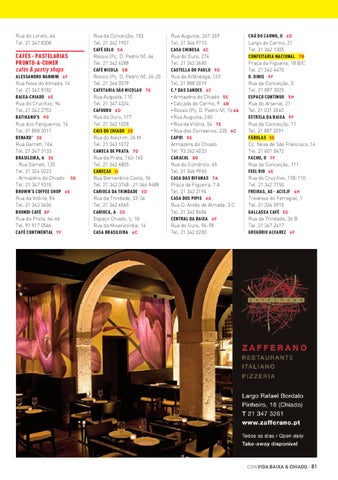 Rua da Conceição, 103 Tel. 21 342 1957 CAFÉ GELO 5 A Rossio (Pç. D. Pedro IV), 64 Tel. 21 342 6288 CAFÉ NICOLA 5 B Rossio (Pç. D. Pedro IV), 24-25 Tel. 21 346 0579 CAFETARIA SÃO NICOLAU 7 E Rua Augusta, 110 Tel. 21 347 4324 CAFOURO 6 D Rua do Ouro, 177 Tel. 21 342 1028 CAIS DO CHIADO 2 G Rua do Alecrim, 26 M Tel. 21 343 1072 CANECA DE PRATA 7 D Rua da Prata, 163-165 Tel. 21 342 6805 CANEÇAS 3 I Rua Bernardino Costa, 36 Tel. 21 342 3748 · 21 346 9488 CARIOCA DA TRINDADE 3 D Rua da Trindade, 32-34 Tel. 21 342 6565 CARIOCA, A 3 D Espaço Chiado, lj. 18 Rua da Misericórdia, 14 CASA BRASILEIRA 6 C