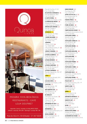 NINHO DOURADO 6 C Rua Augusta, 278 Tel. 21 346 9739 OUTRA FACE DA LUA, A 7 D Rua da Assunção, 22 Tel. 21 886 3430 PADARIA PREGAL 8 B Rua da Madalena, 228 Tel. 21 886 7213 PAINEL DA BAIXA 4 B Calçada do Carmo, 8 Tel. 21 346 9328 PANIFICAÇÃO DO CHIADO 5 D Calçada do Sacramento, 26-32 Tel. 21 342 4044 PASTELARIA CAMÕES 1 E Rua do Loreto, 63 Tel. 21 342 7065 PASTELARIA CARMELITA 5 D Rua do Carmo, 88 Tel. 21 346 1110 PASTELARIA EMENDA 2 E Rua do Loreto, 33 Tel. 21 346 9476 PASTELARIA MADALENA 8 B Rua da Madalena, 279 Tel. 21 886 8034 PASTELARIA NÉNÉ 7 F Rua Augusta, 42 Tel. 21 347 0088 PASTELARIA POMONA 8 E Rua da Prata, 113 Tel. 21 342 6671 PASTELARIA O CONDE 6 E Rua do Crucifixo, 72 Tel. 21 343 0162 PASTELARIA SUIÇA 6 B Rossio (Pç. D. Pedro IV), 96 Tel. 21 321 4090 PASTELARIA VERONA 8 C Rua dos Fanqueiros, 203-205 POLLUX CAFÉ 8 C Rua dos Fanqueiros, 276 - 9º Tel. 21 881 1200 QUENTE & BOM 7 E Rua da Vitória, 46 Tel. 21 346 7135 QUINOA 2 F Rua do Alecrim, 54 Tel. 21 347 9326 QUIOSQUE DE REFRESCO 2 E Praça Luís de Camões RIGOLETO CAFÉ 4 F Rua Capelo, 4 Tel. 21 347 0462 ROJOO 6 C Rua de Santa Justa, 84 Tel. 21 346 2253 ROSSIO CAFFÈ LOUNGE 4 B Estação do Rossio Largo Duque de Cadaval, 17 SACRAMENTO DO CHIADO 5 D Calçada do Sacramento, 40-46