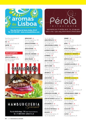BENARD’ 3 E Rua Garrett, 104 Tel. 21 347 3133 BESSA 7 C Rua dos Douradores, 206-210 Tel. 21 887 3832 BISTRO 100 MANEIRAS 2 C Largo da Trindade, 9 Tel. 210 990 475 · 91 030 7575 BRASSERIE DE L’ENTRECÔTE 2F Rua do Alecrim, 117-121 Tel. 21 347 3616 / 93 648 9778 BUFFET DO LEÃO 4 A Rua 1º de Dezembro, 97 Tel. 21 342 6195 CAÇADOR DA OLIVEIRA, O 3 C Rua Oliveira ao Carmo, 71-73 Tel. 21 342 3395 CADETE, O 7 F Rua dos Correeiros, 36-38 CAFÉ BUENOS AIRES 3 B Calçada do Duque, 31 B Tel. 21 342 0739 CAFÉ DO RIO HAMBURGUERIA 9 G Rua da Alfândega, 114 Tel. 21 886 8050 CAFÉ NO CHIADO 3 F Largo do Picadeiro, 10-12 Tel. 21 346 0501 CAFÉ ROYALE 3 D Lg. Rafael Bordalo Pinheiro, 29 Tel. 21 346 9125 CAFETARIA MUSEU S. ROQUE 2 B Largo Trindade Coelho Tel. 21 323 5065 CAIS DO CHIADO 2 G Rua do Alecrim, 26 M Tel. 21 343 1072 CASA ALCOBAÇA 3 C Rua Oliveira ao Carmo, 9 Tel. 21 342 6848 CASA DA MÓ 8 AB Rua Condes de Monsanto, 1 Tel. 21 887 2095 CASTIÇO 6 E Rua dos Sapateiros, 81