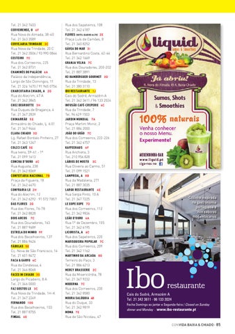 Rua dos Sapateiros, 108 Tel. 21 342 4187 FLORES (HOTEL BAIRRO ALTO) 2 E Praça Luís de Camões, 8 Tel. 21 340 8252 GÁVEA DO MAR 3 I Rua Bernardino Costa, 42-44 Tel. 21 342 1669 GRANJA VELHA 7 C Rua dos Douradores, 200-202 Tel. 21 887 3891 H3 HAMBÚRGUER GOURMET 3 D Rua da Trindade, 13 Tel. 21 380 3110 IBO RESTAURANTE 1 J Cais do Sodré, Armazém A Tel. 21 342 3611 / 96 133 2024 INFUSÃO CAFÉ-CREPERIE 4 C Rua da Trindade, 7 Tel. 96 629 1503 JARDIM MUNDIAL 7 A Praça Martim Moniz, 2 Tel. 21 884 2000 JOÃO DO GRÃO 7 C Rua dos Correeiros, 222-226 Tel. 21 342 4757 KAFFEEHAUS 4 F Rua Anchieta, 3 Tel. 210 956 828 LÁBIOS DE MOSTO 3 C Rua Oliveira ao Carmo, 51 Tel. 21 099 1521 LAMPREIA, A 8 B Rua da Madalena, 271 Tel. 21 887 3035 LARGO RESTAURANTE 4 E Rua Serpa Pinto, 10 A Tel. 21 347 7225 LE XOPE XOPE 7 D Rua dos Correeiros, 112 Tel. 21 342 9836 LEÃO D’OURO 4 A Rua 1º de Dezembro, 105 Tel. 21 342 6195 LICORISTA, A 6 C Rua dos Sapateiros, 220 MARISQUEIRA POPULAR 7 C Rua dos Correeiros, 209 Tel. 21 342 1162 MARTINHO DA ARCADA 8 G Terreiro do Paço, 3 Tel. 21 886 6213 MERCY BRASSERIE 2 C Rua da Misericórdia, 78 Tel. 21 347 9232 MODERNA 7 C Rua dos Correeiros, 230 Tel. 21 342 8580 MOURA SALÚQUIA 4B Rua do Duque, 33 Tel. 21 342 9819 MOMA 7 E Rua de São Nicolau, 47 CON VIDA BAIX A & CHIADO ·