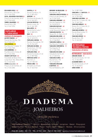 RELOJOARIA SUIÇA 6D Rua do Ouro, 252 e 266 Tel. 21 346 7930 SILVA, JOALHEIROS-PRATEIROS 2 E Praça Luís de Camões, 40-41 Tel. 21 342 6320 TORRES JOALHEIROS 5C Rua do Ouro, 255 Tel. 21 347 2753