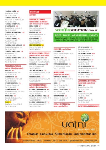 property & real estate CENTURY 21 - ANTIQUA 3 C Rua Nova da Trindade, 22 E Tel. 21 346 9150 LUXUS 1 F Rua da Emenda, 58-1º Tel. 21 322 0340 POSSER & ASSOCIADOS 5 E Rua Garrett, 19 - 3º B Tel. 21 347 4818 REMAX PARTNER 4 B Calçada do Carmo, 7 - 1º Tel. 21 340 8510