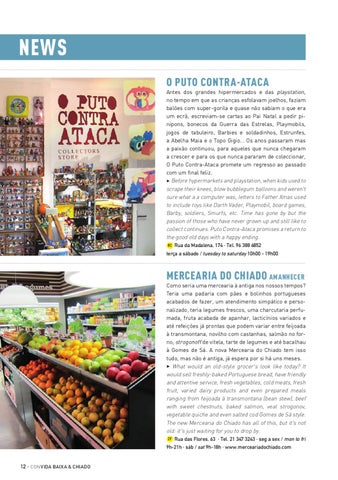 NEWS O PUTO CONTRA-ATACA Antes dos grandes hipermercados e das playstation, no tempo em que as crianças esfolavam joelhos, faziam balões com super-gorila e quase não sabiam o que era um ecrã, escreviam-se cartas ao Pai Natal a pedir pinipons, bonecos da Guerra das Estrelas, Playmobils, jogos de tabuleiro, Barbies e soldadinhos, Estrunfes, a Abelha Maia e o Topo Gigio… Os anos passaram mas a paixão continuou, para aqueles que nunca chegaram a crescer e para os que nunca pararam de coleccionar, O Puto Contra-Ataca promete um regresso ao passado com um final feliz. 3 Before hypermarkets and playstation, when kids used to scrape their knees, blow bubblegum balloons and weren't sure what a a computer was, letters to Father Xmas used to include toys like Darth Vader, Playmobil, board games, Barby, soldiers, Smurfs, etc. Time has gone by but the passion of those who have never grown up and still like to collect continues. Puto Contra-Ataca promises a return to the good old days with a happy ending. 8C