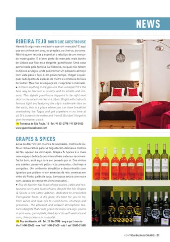 GRAPES & SPICES A rua do Alecrim tem molhos de novidades, molhos de cafés e restaurantes para se degustarem delícias e molhos de fãs, apesar da inclinação. Grapes & Spices é o mais novo espaço dedicado aos irresistíveis sabores nacionais. Se for bom, está aqui para ser provado por si. Dos vinhos aos azeites, passando pelos ricos presuntos, chutneys e compotas. Um ambiente simpático e descontraído com iguarias que podiam vir em ementas de reis: ameixas em vinho do Porto, patés de caça, damascos secos com noz e rum, passas de cereja em vinho moscatel… 3 Rua do Alecrim has loads of new places, cafés and restaurants to try and loads of fans, despite the hill. Grapes & Spices is the latest addition, dedicated to irresistible Portuguese foods. If it's good, it's here for you to try, from wines and olive oils to cured hams, chutneys and preserves. The pleasant and relaxed atmosphere features delights that could grace the menu of kings: plums in port wine, game patés, dried apricots with walnuts and rum, cherry raisins in muscatel… 2G