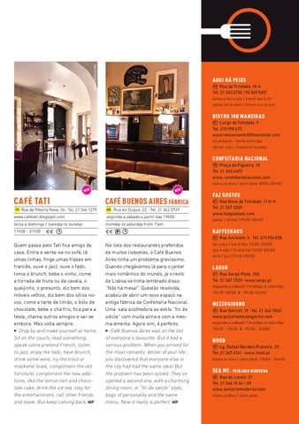 Quem passa pelo Tati fica amigo da casa. Entra e senta-se no sofá, lê umas linhas, finge umas frases em francês, ouve o jazz, ouve o fado, toma o brunch, bebe o vinho, come a torrada de truta ou de cavala, o queijinho, o presunto, diz bem dos móveis velhos, diz bem dos sítios novos, come a tarte de limão, o bolo de chocolate, bebe o chá frio, fica para a festa, chama outros amigos e vai-se embora. Mas volta sempre. 3 Drop by and make yourself at home. Sit on the couch, read something, speak some pretend French, listen to jazz, enjoy the fado, have brunch, drink some wine, try the trout or mackerel toast, compliment the old furniture, compliment the new additions, like the lemon tart and chocolate cake, drink the ice tea, stay for the entertainment, call other friends and leave. But keep coming back. MP