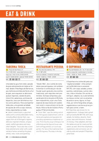 O Sopinhas era conhecido pela sua “vegetarianeidade”, tinha sempre um buffet delicioso e acessível (E9,70), com sopa, saladas, pratos quentes, sobremesas, sumos naturais, chás e infusões. Em vez de se extinguir, adaptou-se, e pôs talheres na mesa a contar com os amantes de peixe e carne. Agora, no Sopinhas, por entre fotografias antigas, vegetarianos e carnívoros já se juntam para comer, e bem. 3 O Sopinhas was known for its vegetarianism. It always had a great well-priced buffet (i9.70), with soup, salads, hot dishes, deserts, fresh juices, teas and infusions. Instead of closing, it has adapted, and now the tables are set for meat and fish eaters as well. Amid the old photos, vegetarians and carnivores can sit side by side and sample O Sopinhas great food.